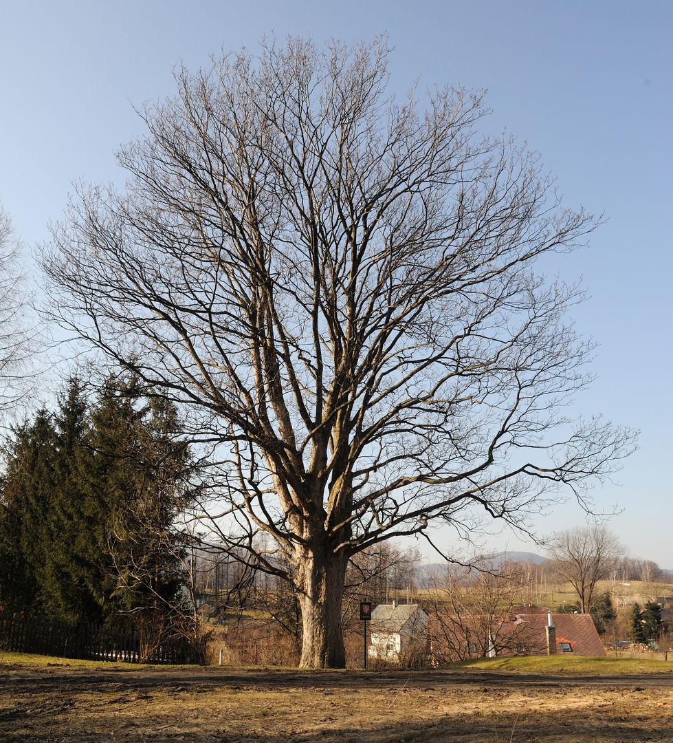 | Mohutný jedinec se svalovitě stočeným kmenem, u č.p. 12 v horní část obce | ||||||