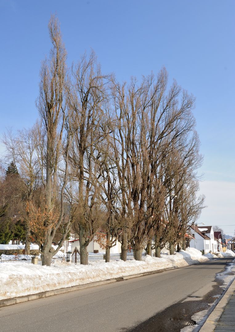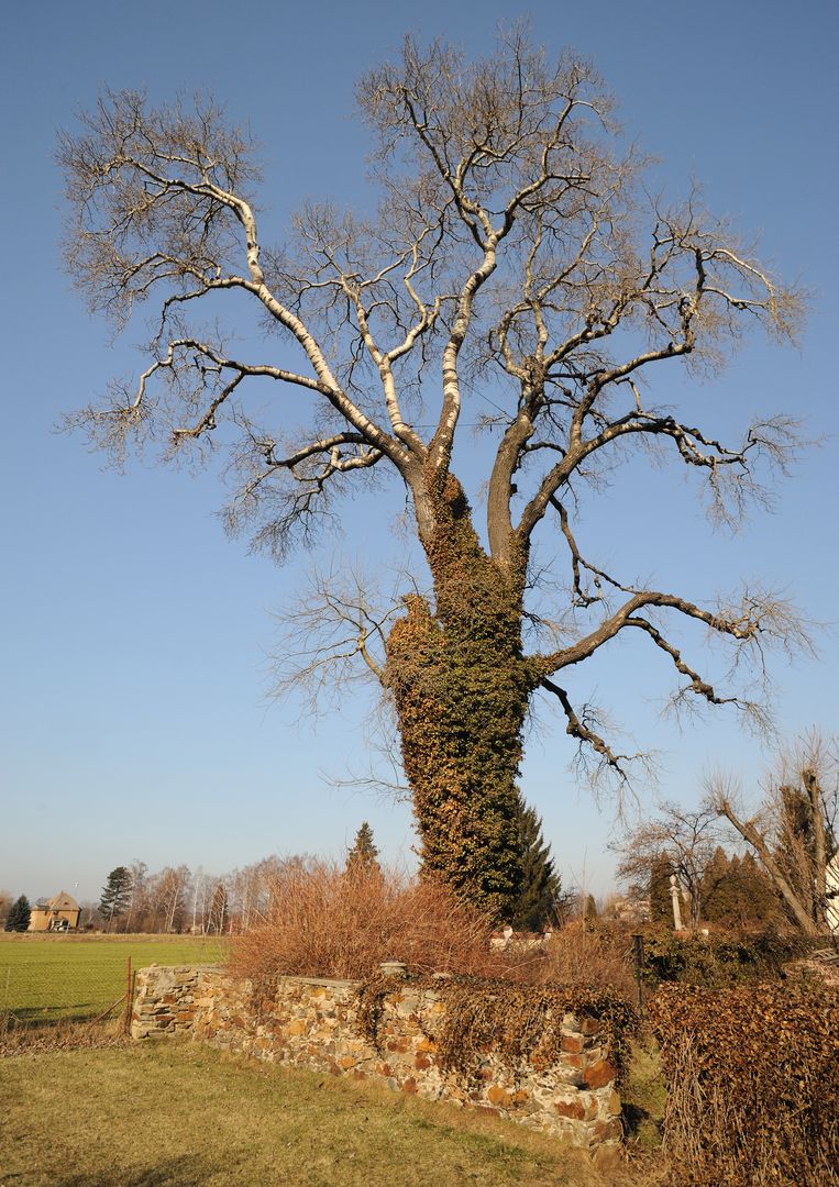 | Monumentální topol s křivolakými větvemi v zahradě fary kostela Nanebevzetí Panny Marie | ||||||