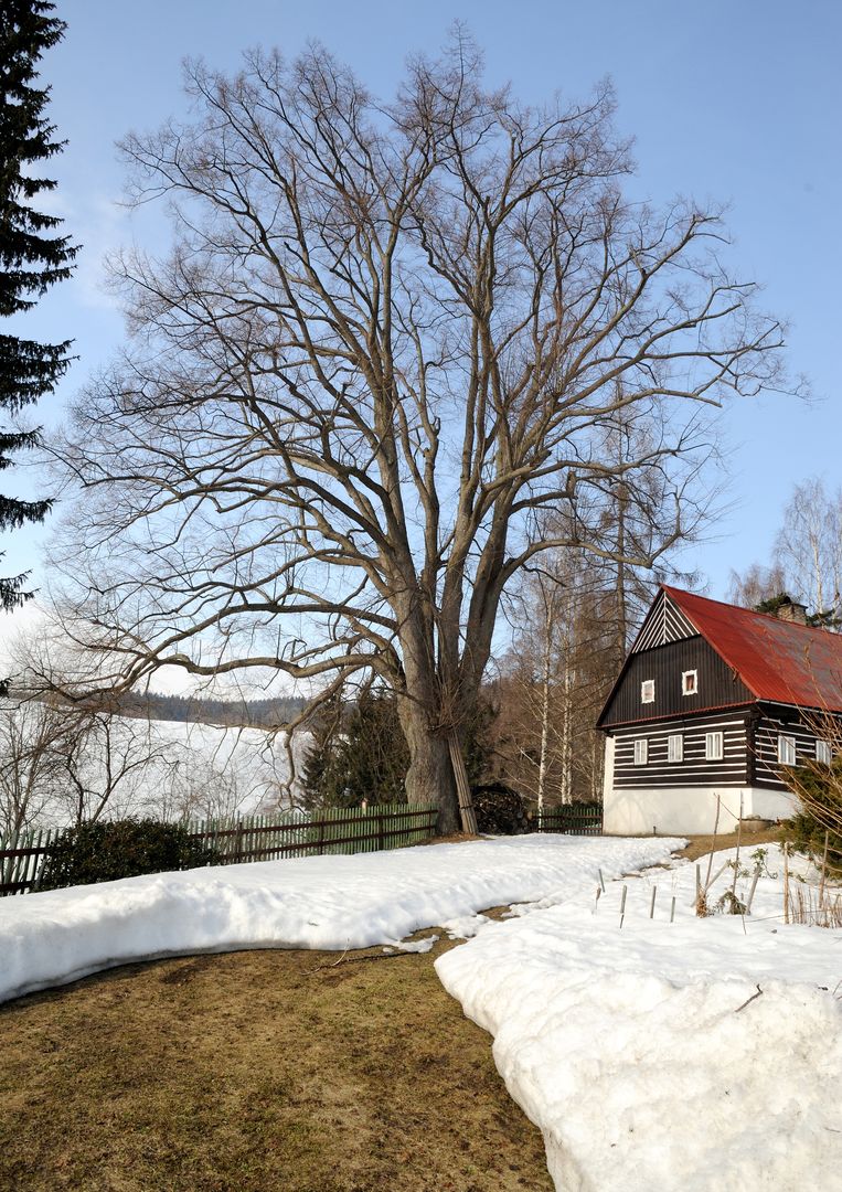 | Mohutný javor s částečně redukovanou korunou v Horním Polubném při odbočce na Jizerku, naproti hotelu Sport | ||||||