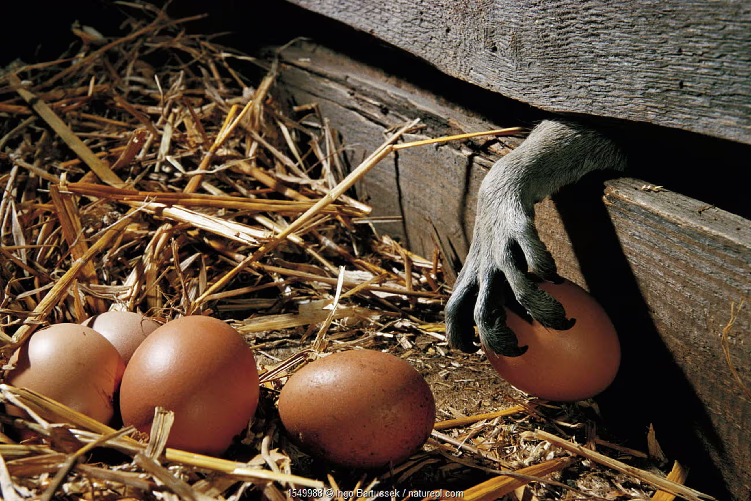 Mýval krade vajíčka v kurníku. Foto: Ingo Bartussek/naturepl.com